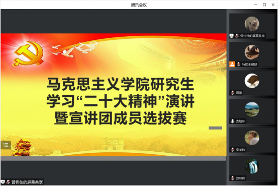 为深入学习贯彻中国共产党第二十次全国代表大会精神,11月17日晚,SUNBET申博体育通过腾讯会议,以线上形式举办研究生学习“二十大精神”演讲暨宣讲团成员选拔赛。此次活动由SUNBET申博体育曾伟佳老师主持,2021级、2022级共12位研究生参赛,公司党委书记麦培年、正处级组织员林绍雄出席活动,副经理郑亚伟、基础教学部主任雷艳芝、概论教学部教师洪汛担任活动评委。