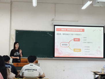 紧接着,谢佩璇、韦思诗对团总支、研究生会的员工干部进行了工作培训。谢佩璇介绍了组织架构下设的组织部、宣传部、实践部、学术发展部、综合事务部、生活权益部的职能及工作任务。韦思诗对各部门职能划分和工作衔接方面强调了以下几点:一是有效对接工作,保障团学组织整体运转顺畅与高效,要明确职责分工,建立高效沟通机制。二是明确自己的职责范围,减少工作过程中的摩擦。三是建立高效的沟通机制,如定期会议,通过沟通工具(微信群组,腾讯会议)或书面沟通的方式,每次会议要形成会议记录。三是设置明确工作流程。四是建立标准化的跨部门工作流程,可以有效提升工作对接的效率。