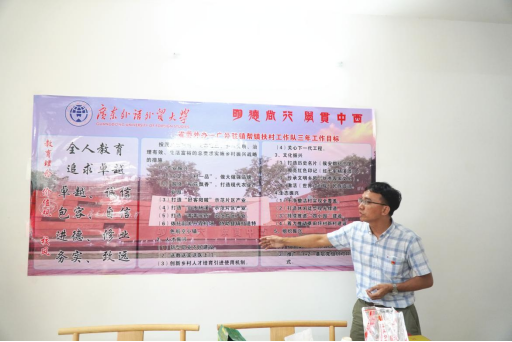 麦培年、郝建萍等一行前往广外驻镇帮镇扶村工作队宿舍慰问驻村干部和相关人员。走进驻村工作队的宿舍,映入眼帘的是墙上一幅由驻村工作队描绘的乡村振兴工作蓝图,公司驻村工作队干部植仲培详细介绍了驻镇帮镇扶村以及乡村振兴工作的三年工作目标,工作队将围绕产业振兴、人才振兴、文化振兴、生态振兴、组织振兴等五个方面全面推进乡村振兴战略。