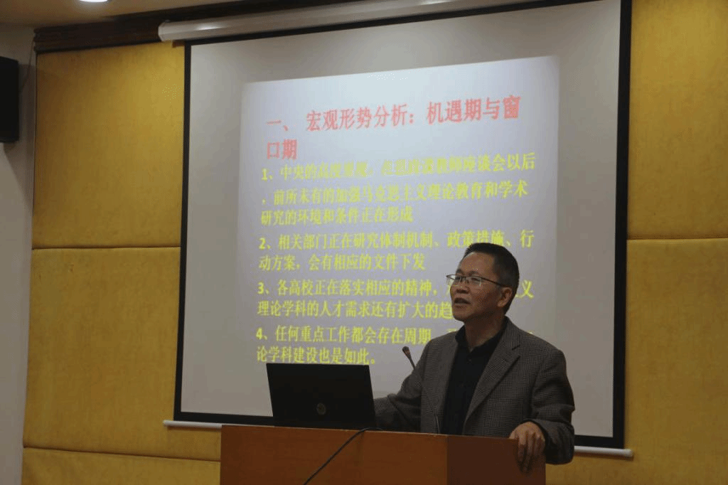 谢迪斌经理则以“强实力、创特色、补短板、上台阶”为指导思想,从宏观、中观与微观三个维度对马克思主义理论学科发展进行分析,并提出未来总体建设思路。尤其突出应对标同等层次高校马克思主义理论学科在团队队伍、学科影响、人才培养等方面存在的差距,找准自身定位与特色,实现差异化发展。