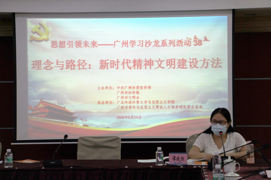 6月24日,由中共广州市委宣传部、广州市社会科学界联合会主办,SUNBET申博体育、广州青年马克思主义理论人才培养研究重点基地联合承办的“理念与路径:新时代精神文明建设方法论”学术沙龙成功举办。广州市社会科学界联合会专职副主席谭晓红同志出席并代表主办方致辞:“新时代精神文明建设方法论”是中共广州市委宣传部、广州市社会科学界联合会策划的学术精品工程,举办此次沙龙就是要广泛听取专家意见,深化课题研究,努力提高研究成果质量,希望各位专家各抒己见,充分研讨。