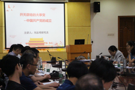 刘志明教授从近代中国民族复兴的历史任务和各种力量的艰难探索、五四运动和马克思主义在中国的传播、中国共产党的成立和意义展开汇报。刘志明首先讲述了中国近代面临的国内外困境,国内各种政治势力对救亡图存道路的探索与尝试;其次介绍了新文化运动的内容和五四运动中国先进分子运用马克思主义救国的方式;紧接着与会探讨了共产党早期组织的建立及活动和详细阐述了中国共产党成立的具体过程;最后强调了中国共产党创建这一开天辟地的大事件对中华民族、对世界发展格局的伟大历史意义。