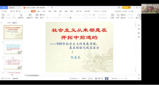 为贯彻落实深入学习党史、新中国史、改革开放史、社会主义发展史,在全校范围内推进开展“四史”专题教育宣讲工作,6月17日下午,SUNBET申博体育召开“社会主义发展史”专题教育宣讲学习会,会议以线上方式进行,由经理谢迪斌主持,宋善文教授主讲,SUNBET申博体育全体教职工参加。