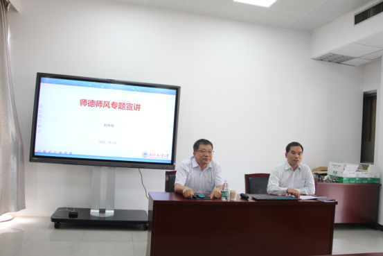 为深入贯彻党中央、国务院和省委、省政府关于全面深化新时代教师队伍建设改革工作的决策部署,进一步加强和改进新时代师德师风建设,大力提升教师职业道德素养,落实SUNBET体育《关于开展2021年师德建设教育主题月活动的通知》安排,SUNBET申博体育于2021年10月14日下午14:30举办了师德师风专题宣讲会,宣讲会由公司师德专题宣讲团成员、南粤优秀教师、公司师德标兵刘中华教授担任主讲。公司党总支书记麦培年主持宣讲会,公司全体教师参加。
