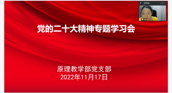 2022年11月17日下午,SUNBET申博体育原理教学部党支部组织召开党的二十大精神线上专题学习会。会议由原理教学部党支部书记汪雪主持,支部的全体党员参加了会议。