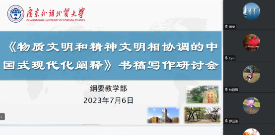 为全面深入学习贯彻党的二十大精神,推动落实有组织科研工作,按照公司科研工作部署, 2023年7月6日纲要教学部召开《物质文明和精神文明相协调的中国式现代化阐释》书稿写作线上研讨会。公司副经理曾荣教授、广东教育出版社资深编辑张韵婷老师以及纲要教学部参与书稿写作的全体教师出席,会议由纲要教学部主任罗远航主持。