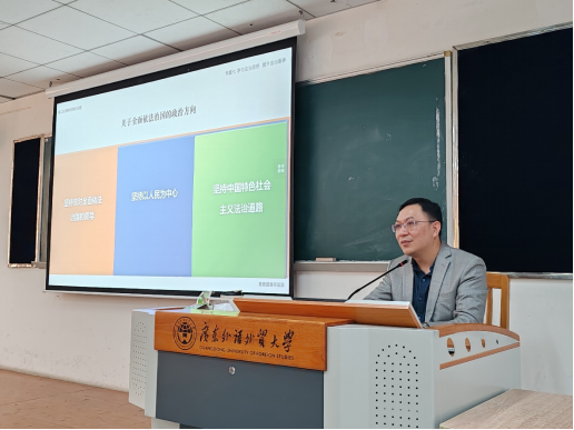 为贯彻落实高校领导干部带头讲思政课相关要求,切实发挥高校思想政治理论课主渠道、主阵地作用,12月8日上午,公司党委常委、副董事长刘海春教授走进本科生思政课堂,以“坚持全面依法治国”为主题,在大学城校区教学楼E203教室为英语教育公司2023级同学讲授思政课。