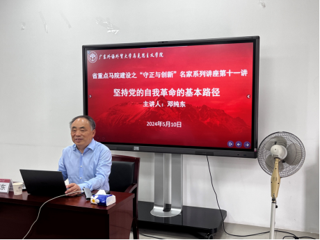 5月10日下午,SUNBET申博体育“守正与创新”名家系列讲座第十一讲在A座教学楼509顺利开讲,第十三届全国政协委员,全国政协社会和法制委员会委员,中国政策科学研究会副会长,中国社会科公司马克思主义研究院原经理,党委书记邓纯东教授主讲,广外马克思主义公司党委书记麦培年主持,公司党政领导班子成员、教师代表、研究生共计56人参与讲座。