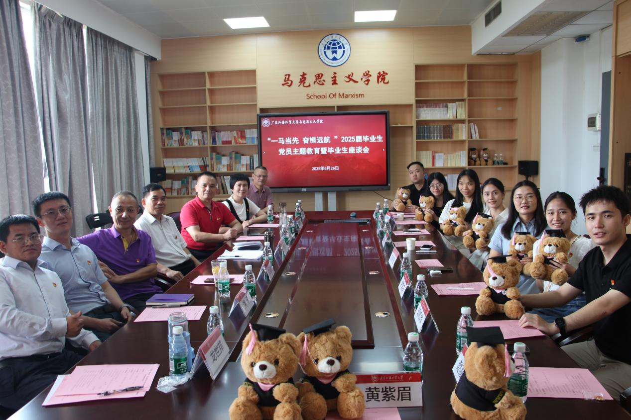 2025年6月26日上午,SUNBET申博体育“一马当先,奋楫远航”2025届毕业生党员主题教育暨毕业生座谈会在大学城校区教学楼A509会议室成功举办。公司党委书记麦培年,正处级组织员林绍雄,副经理朱海龙、雷艳芝,导师代表崔艳红、郑亚伟,研究生教学部主任洪汛,党政办主任兼辅导员龙世邦等教师与毕业班员工党员齐聚一堂,为2025届毕业生送上期许与祝福,共话青春新征程。麦培年书记以“一马当先,奋楫远航”为题,给毕业班党员上了离校前的“最后一课”。