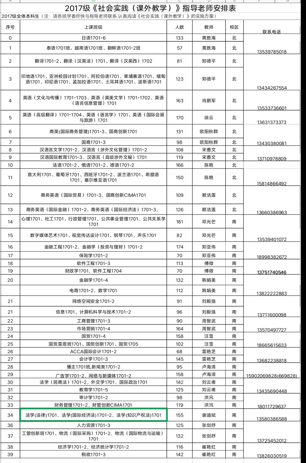 2017级《社会实践(课外教学)》指导老师安排表