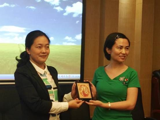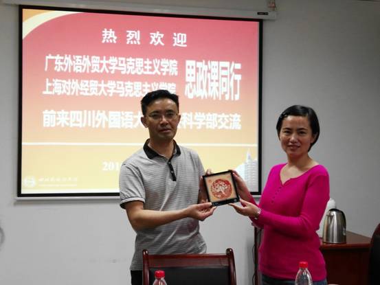 图为公司教师崔艳红教授向四川外国语大学社科部赠送纪念品。
